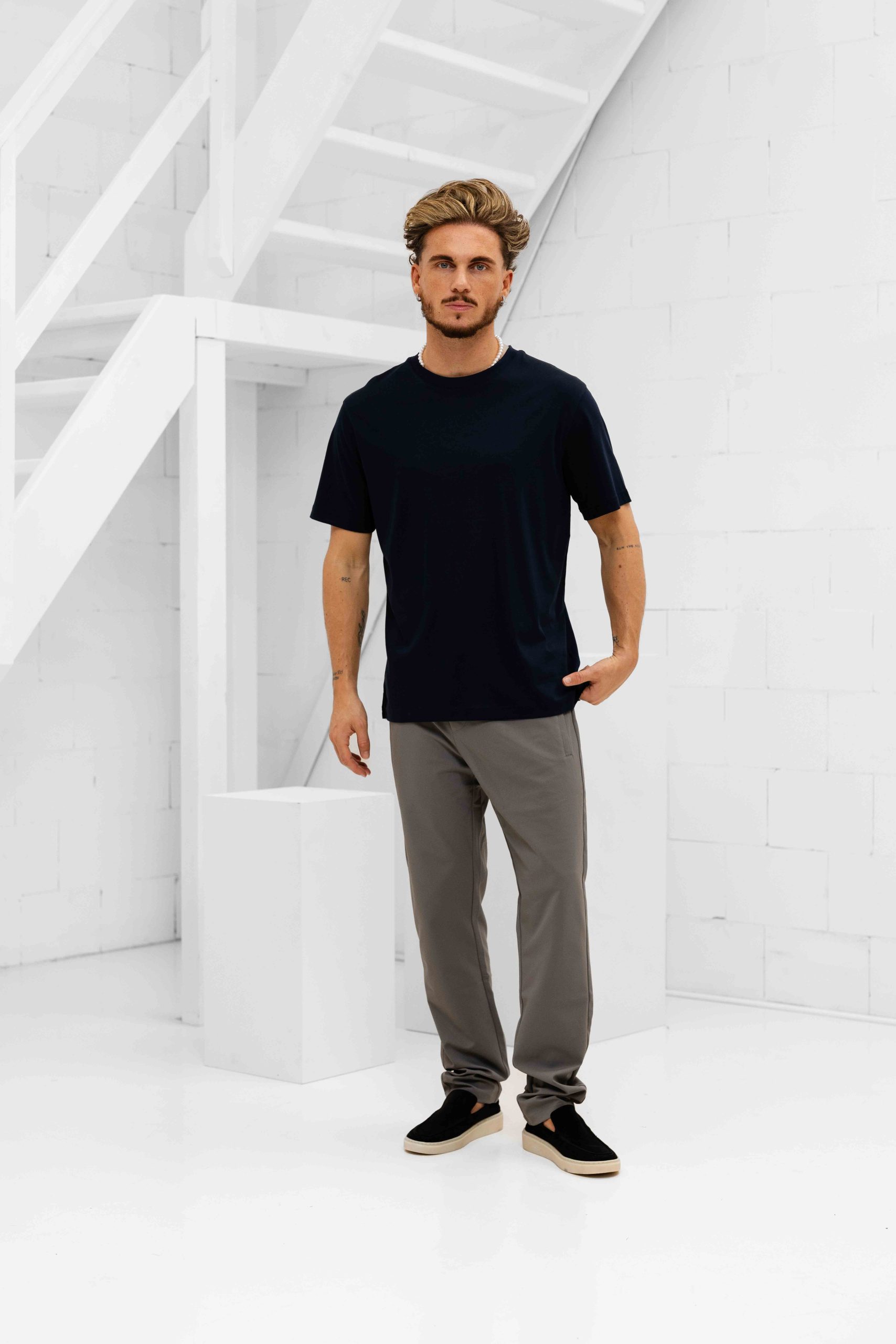 Brandon is 1 meter 80 lang, zijn gewicht is 76 kilo en hij draagt een maat M top en een maat 32 broek.
