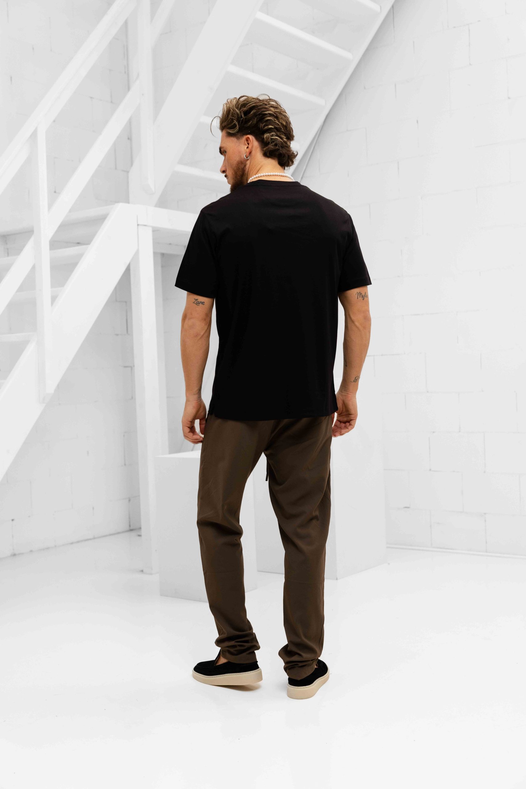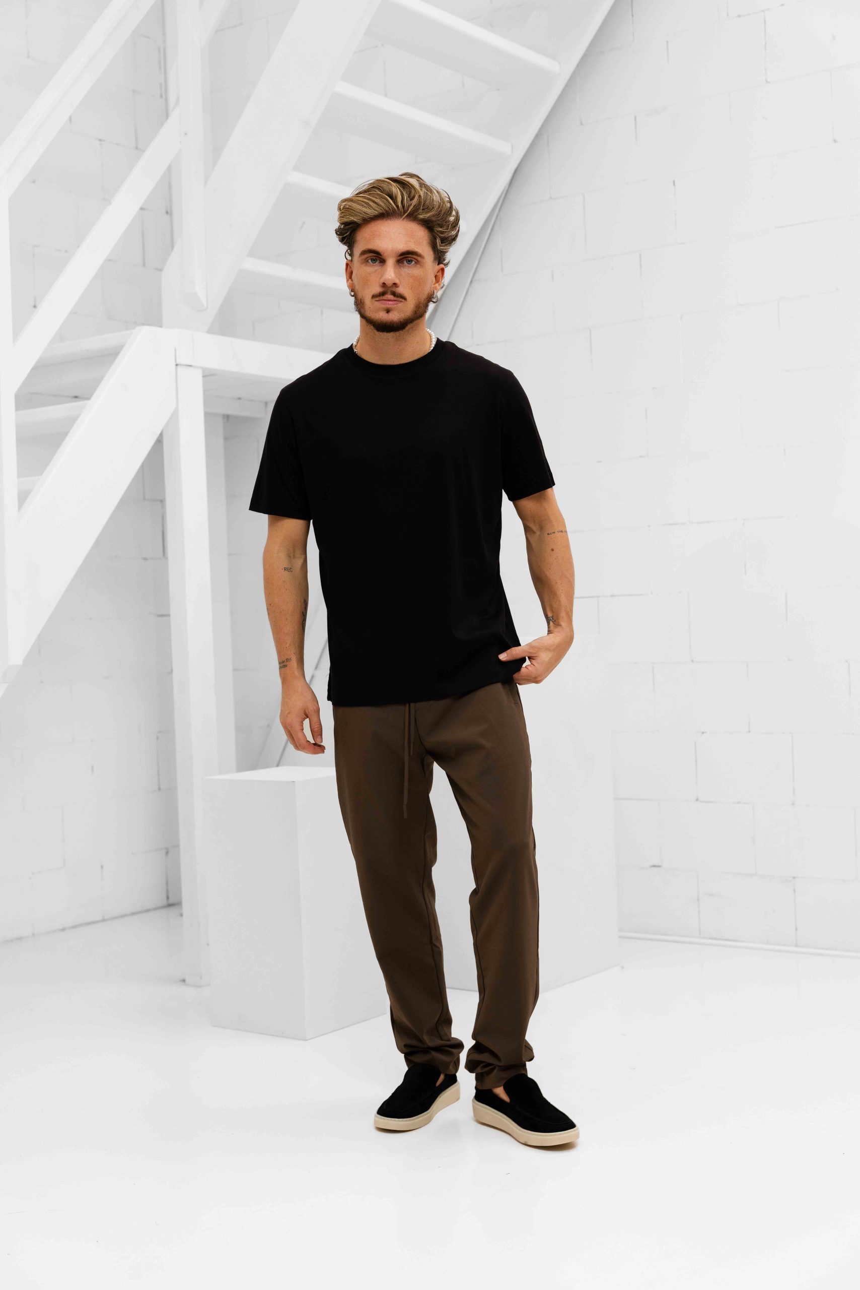Brandon is 1 meter 80 lang, zijn gewicht is 76 kilo en hij draagt een maat M top en een maat 32 broek.