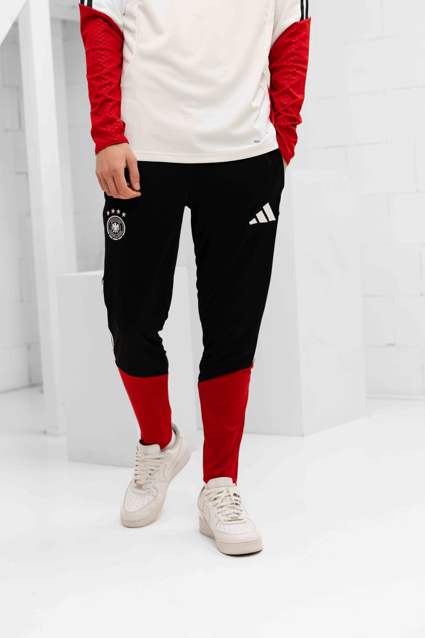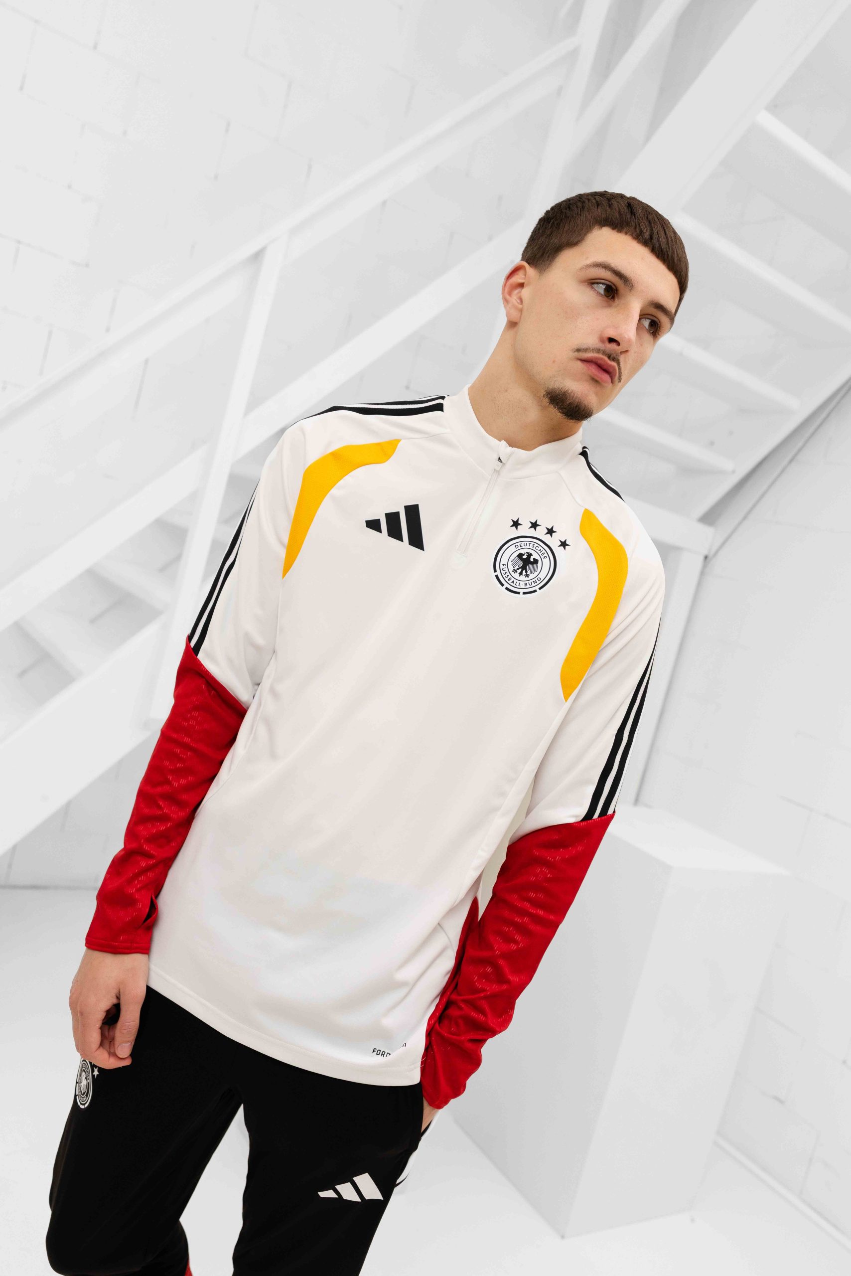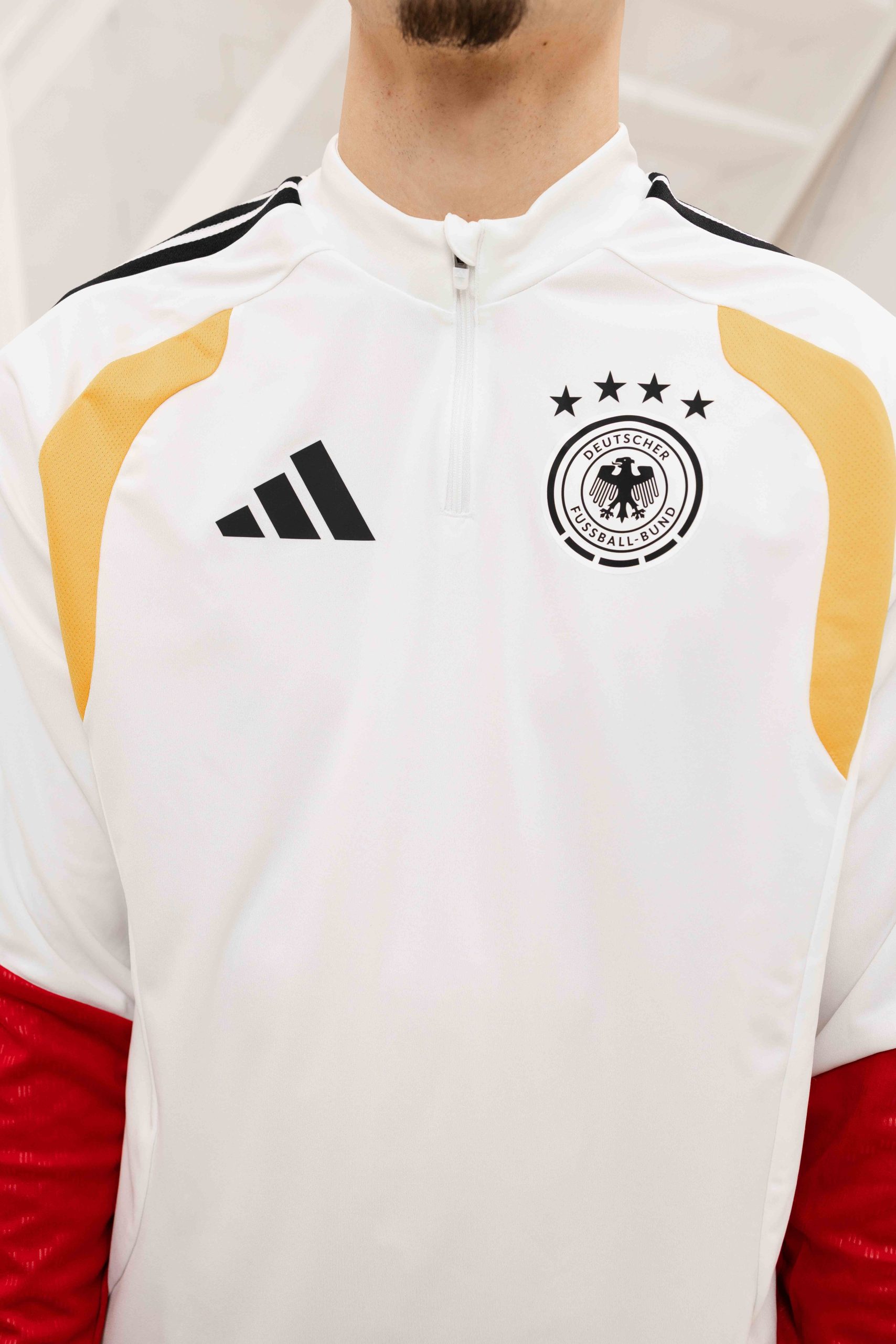 Het Duitsland Tiro Trainingspak Senior 2026/2028 is een must-have item voor heren die graag in stijl willen trainen tijdens de herfst en winter. Dit trainingspak van Adidas is gemaakt van 100% gerecycled polyester en heeft een slimfit pasvorm voor een sportieve uitstraling. De kraag en korte mouwen zorgen voor een comfortabele pasvorm, terwijl de ritssluiting zorgt voor extra gemak bij het aan- en uittrekken. De kleurencombinatie van rood, wit, zwart en geel in een effen patroon met logoprint maken dit trainingspak een echte eyecatcher. Met dit trainingspak laat je zien dat je een echte fan bent van het Duitse voetbalteam! Let op: dit trainingspak heeft geen zakken.