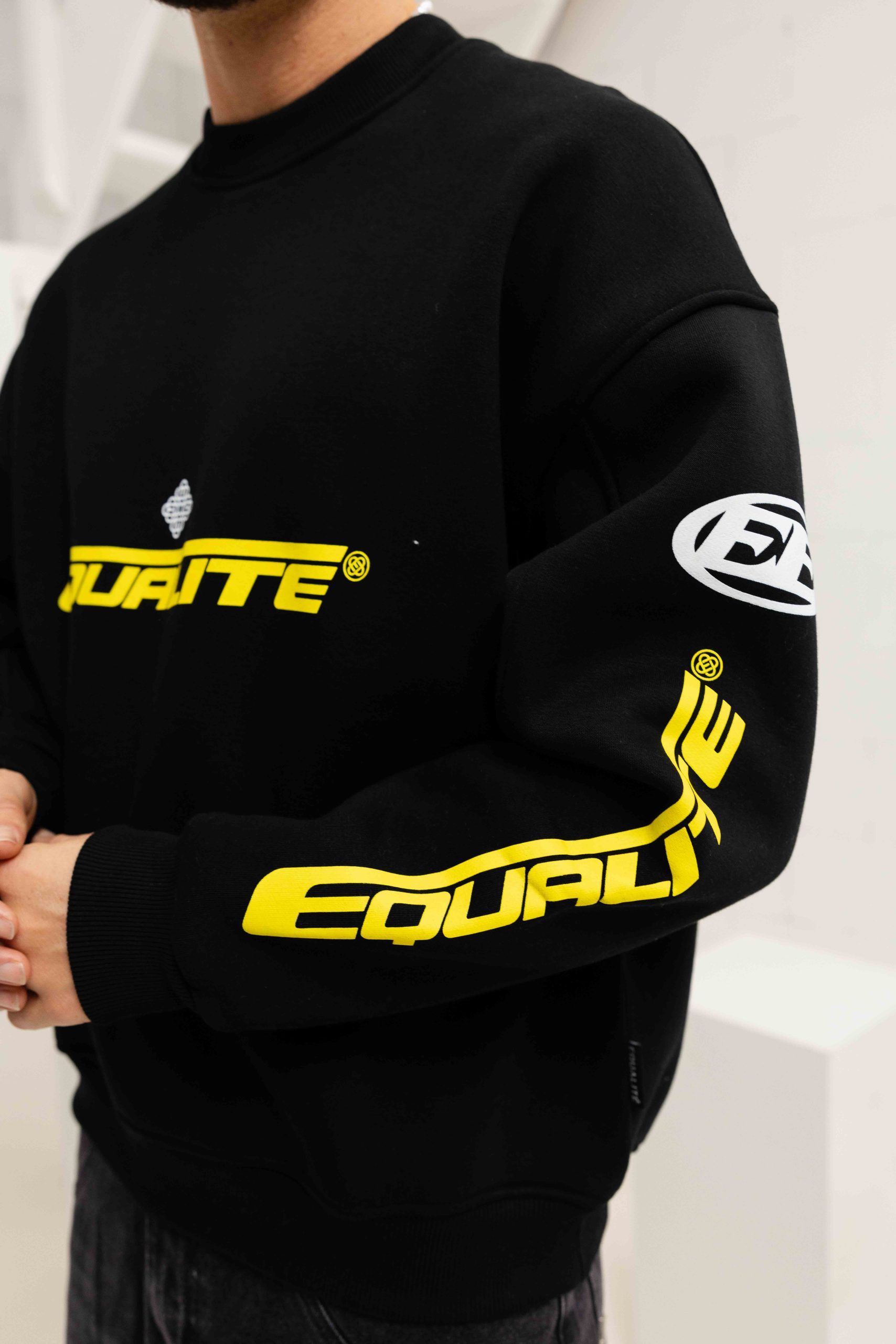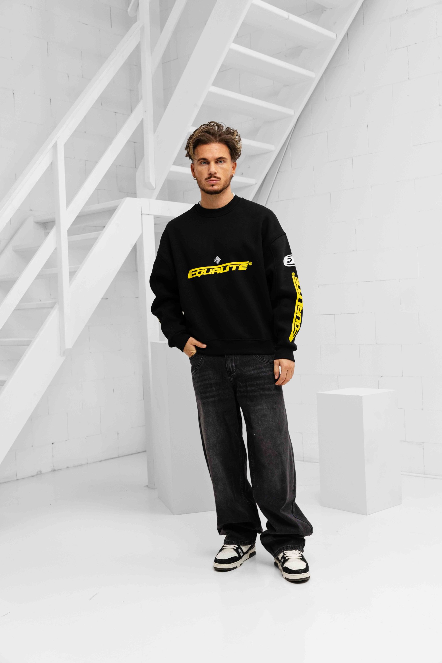De Equalité Arena Sweater voor heren is een must-have item voor het komende herfst/winterseizoen. Deze zwarte sweater met ronde hals is gemaakt van 100% katoen, waardoor hij heerlijk zacht en comfortabel is om te dragen. De lange mouwen en oversized pasvorm zorgen voor een ruime fit. Het effen ontwerp wordt aangevuld met een opvallende backprint, wat zorgt voor een stoere uitstraling. Deze sweater heeft geen sluiting en geen zakken, waardoor hij een minimalistische en moderne look heeft. Kies voor stijl en comfort met de Equalité Arena Sweater!