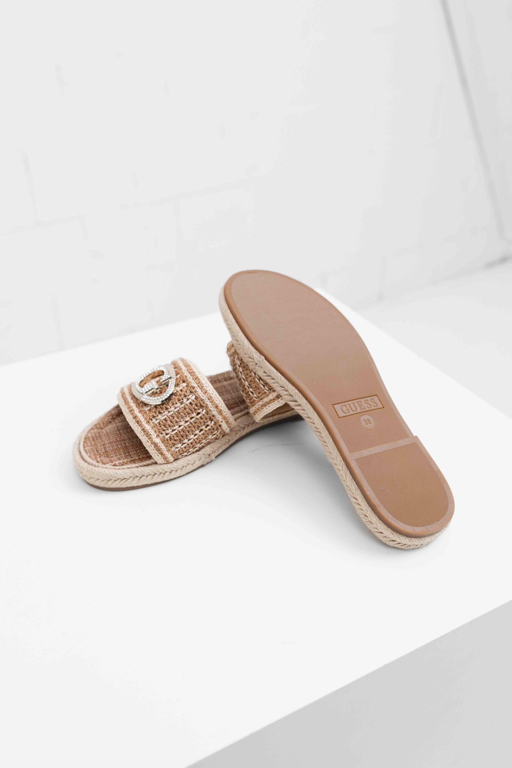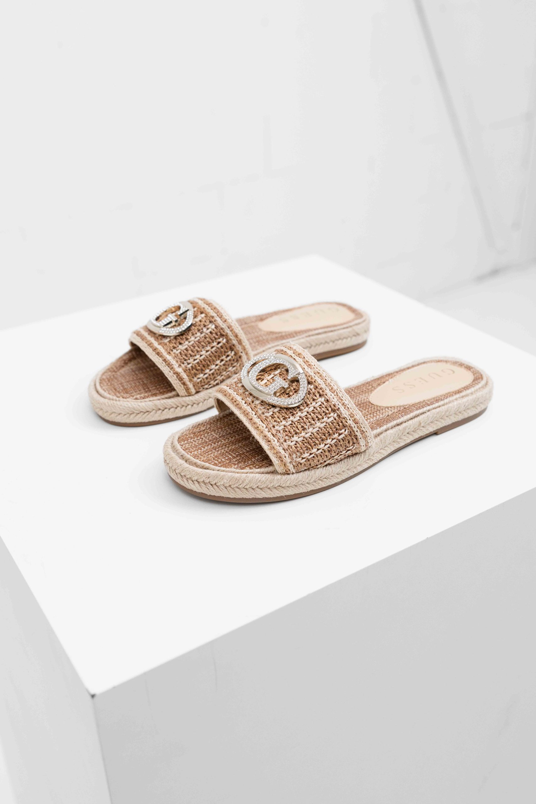 De Guess Kaylis Logo Sandalen voor dames in beige zijn perfect voor de lente/zomercollectie. Deze stijlvolle slippers zijn voorzien van een trendy logoprint en een effen kleur die gemakkelijk te combineren is met verschillende outfits. Met geen sluiting zijn ze gemakkelijk aan en uit te trekken. Laat je voeten stralen in deze comfortabele en fashionable sandalen van het bekende merk Guess.