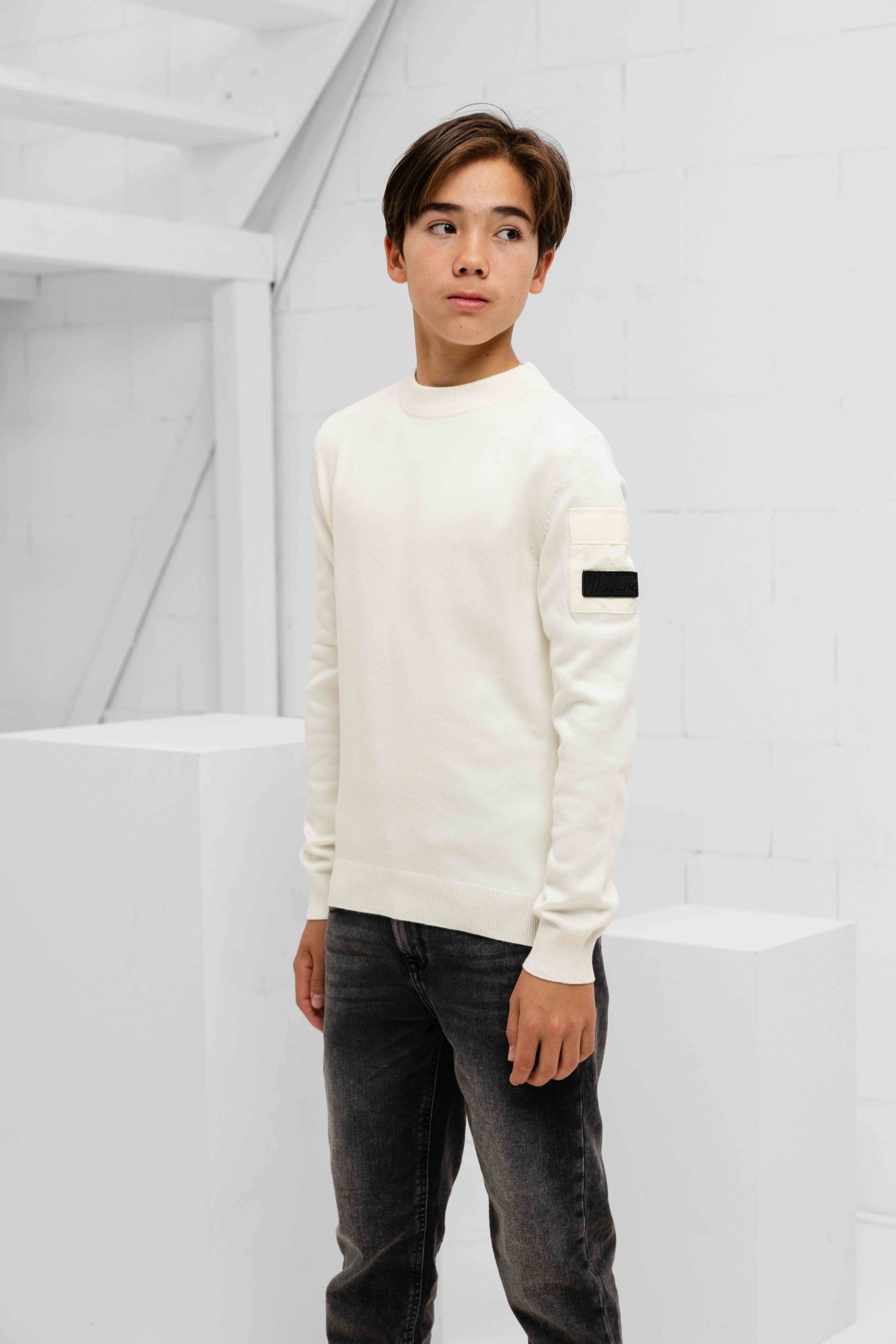 De Malelions Knitted Pocket Sweater Kids in gebroken wit is perfect voor de herfst- en wintercollectie. Deze sweater is speciaal ontworpen voor kinderen en heeft een ronde hals en lange mouwen. De pasvorm is slimfit en het patroon is effen, waardoor het gemakkelijk te combineren is met verschillende outfits. Gemaakt van 52% viscon, 28% elastane en 20% polyamide, is deze sweater niet alleen stijlvol maar ook comfortabel om te dragen. Met zijn tijdloze uitstraling en hoogwaardige kwaliteit is de Malelions Knitted Pocket Sweater Kids een must-have voor de garderobe van elk kind. Geen zakken voor een strakke en minimalistische look.