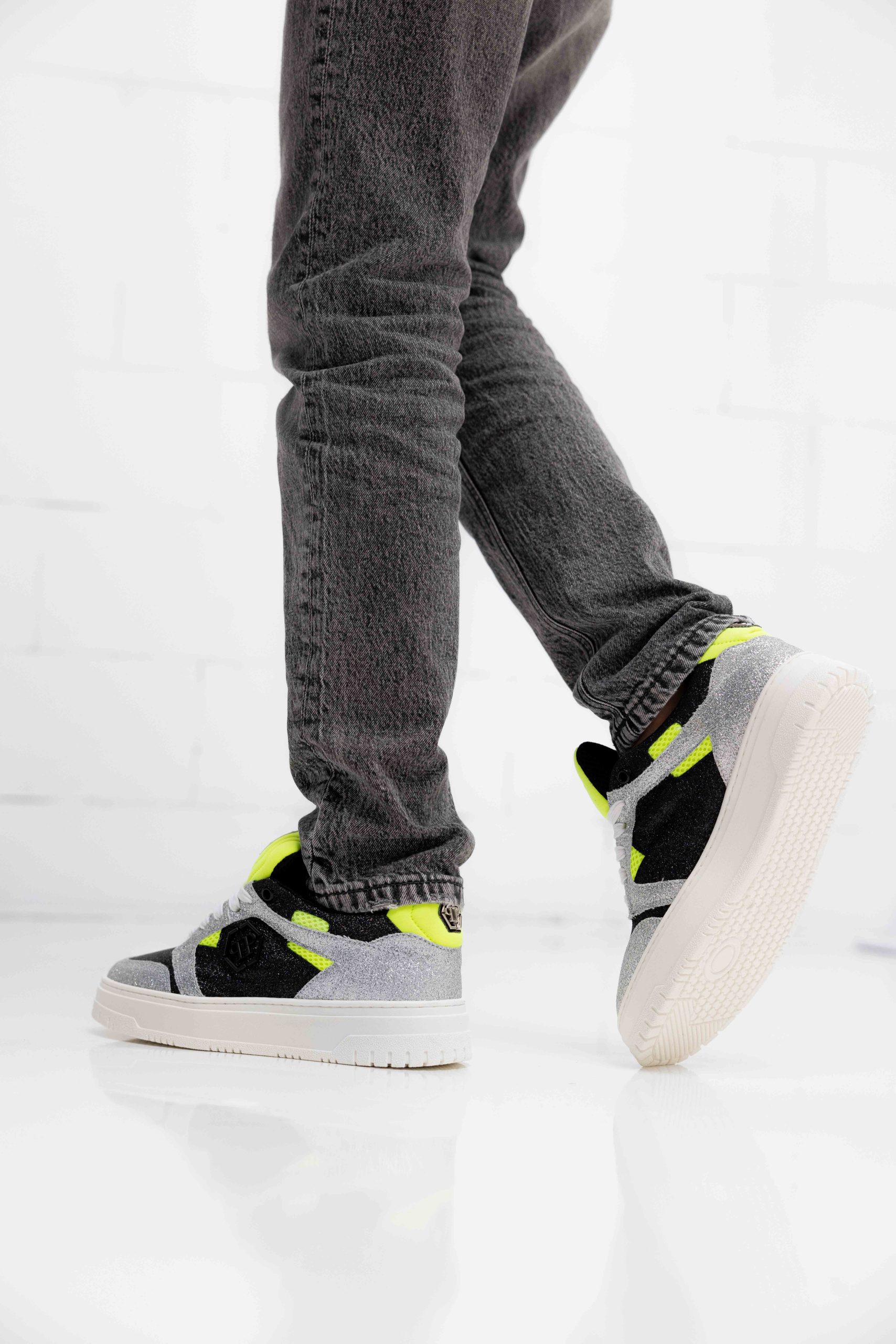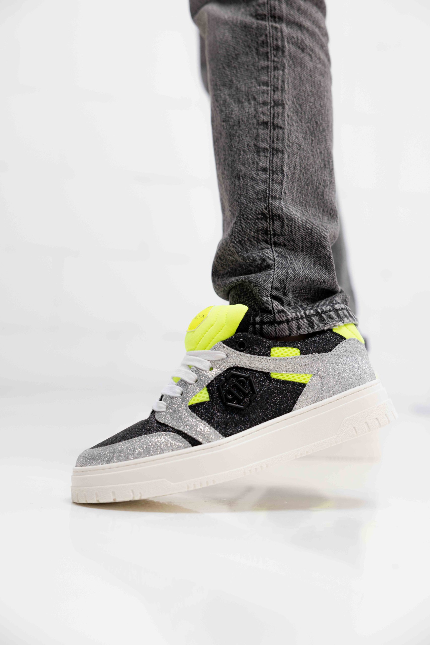 De Philipp Plein 78008 Sneakers Kids Glitter zijn perfect voor de lente/zomer collectie. Deze sneakers zijn speciaal ontworpen voor kinderen en hebben de kleurencombinatie zilver, zwart en groen. De sneakers zijn gemaakt van hoogwaardig rubber en hebben een normale pasvorm. Het colourblock en glitter patroon geven de schoenen een unieke en opvallende uitstraling. Met deze trendy sneakers steelt jouw kind zeker de show!