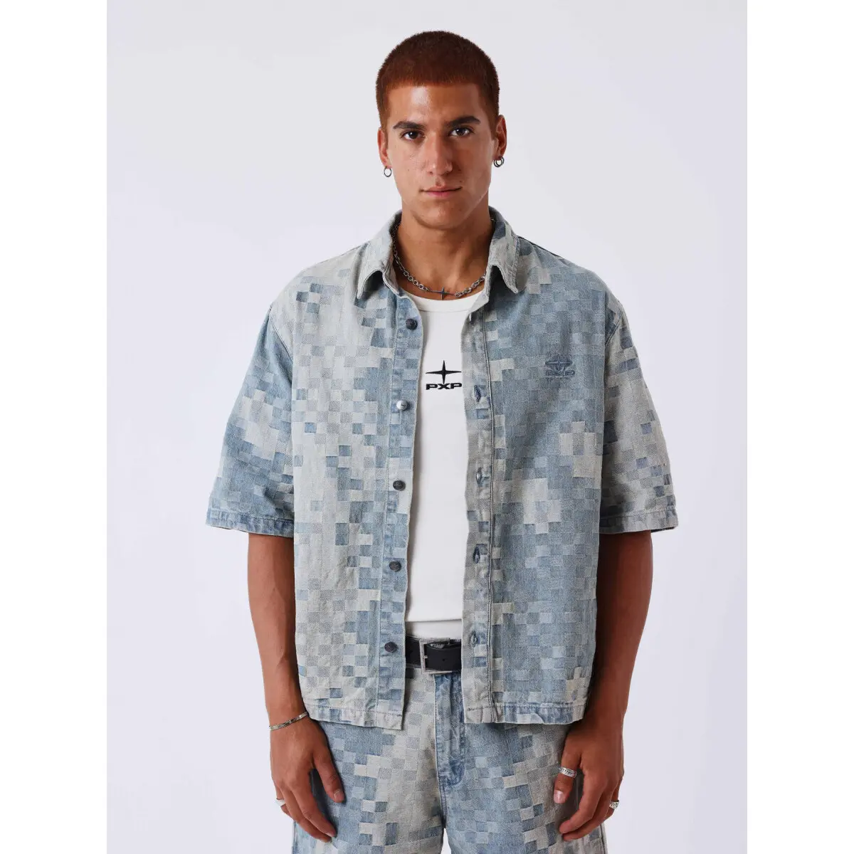 De Project X Paris 2693115 Denim Zomerset voor heren is perfect voor de lente/zomer collectie. Deze lichtblauwe set bestaat uit een kraagshirt met korte mouwen en een bijpassende broek. De set heeft een loosefit pasvorm en is gemaakt van een mix van katoen, polyester en viscose voor een comfortabele en luchtige feel. Het shirt heeft een knoopsluiting en is voorzien van twee zijzakken. Het design is eenvoudig maar stijlvol, met een effen, geruit en logoprint patroon. Ideaal voor een casual en trendy look tijdens warme dagen. Met de Project X Paris zomerset ben je helemaal klaar voor de zomer!